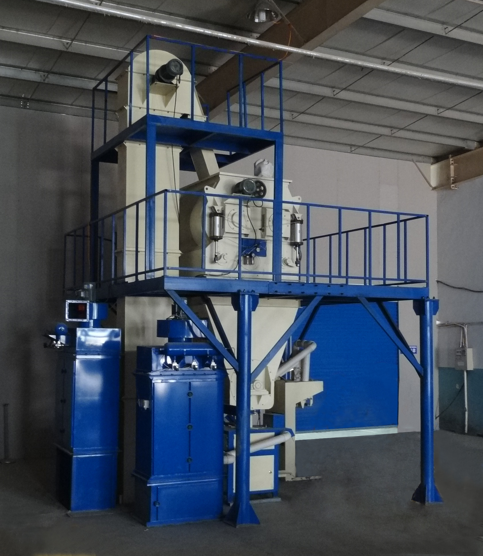 3、首先開啟斗式提升機(jī)、空氣壓縮機(jī)和除塵器,啟動(dòng)配料稱斗開始工作,并將配好的物料由斗提提至待混倉。