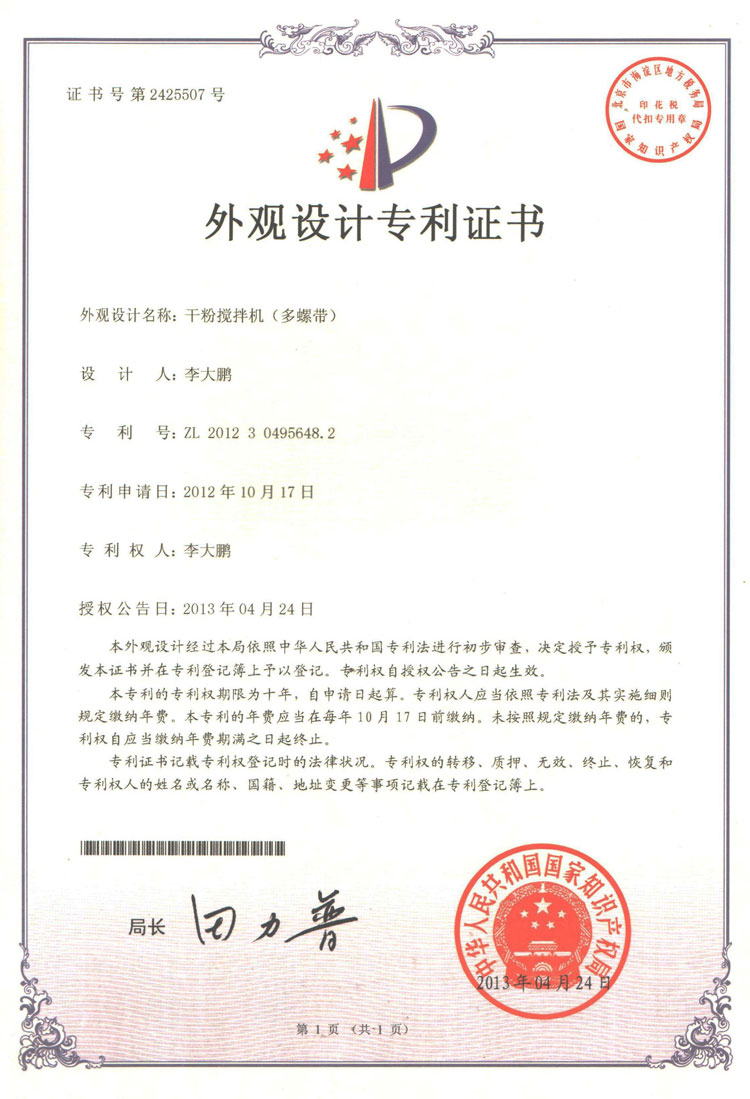 干粉攪拌機(jī)外觀設(shè)計(jì)專利證書